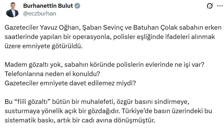 CHP Halkla İlişkiler ve Medyayla İlişkilerden Sorumlu Genel Başkan Yardımcısı Burhanettin Bulut ise, “Bu “fiili gözaltı” bütün bir muhalefeti, özgür basını sindirmeye, susturmaya yönelik açık bir gözdağıdır.” diyerek tepki gösterdi. Bulut’un konuya dair paylaşımı ise şöyle: