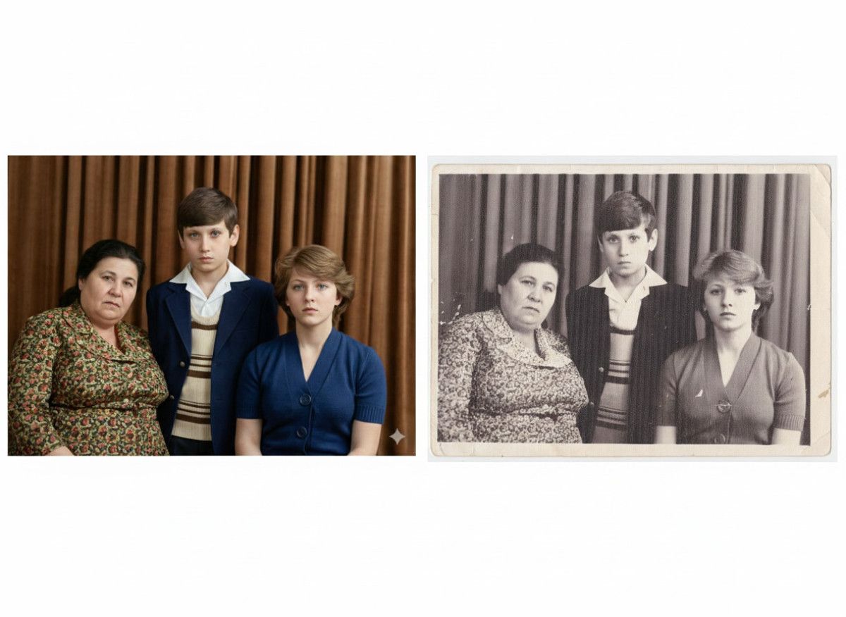 “Eski bir vintage fotoğrafın ultra-gerçekçi şekilde yeniden oluşturulması; orijinal yüz tamamen korunarak (hiçbir değişiklik yapılmadan). Güncellenmiş canlı renkler, pürüzsüz ve gerçekçi cilt dokuları ile doğal ışıklandırma kullanılarak modern, yüksek kaliteli bir dijital portreye dönüştürülmesi.”