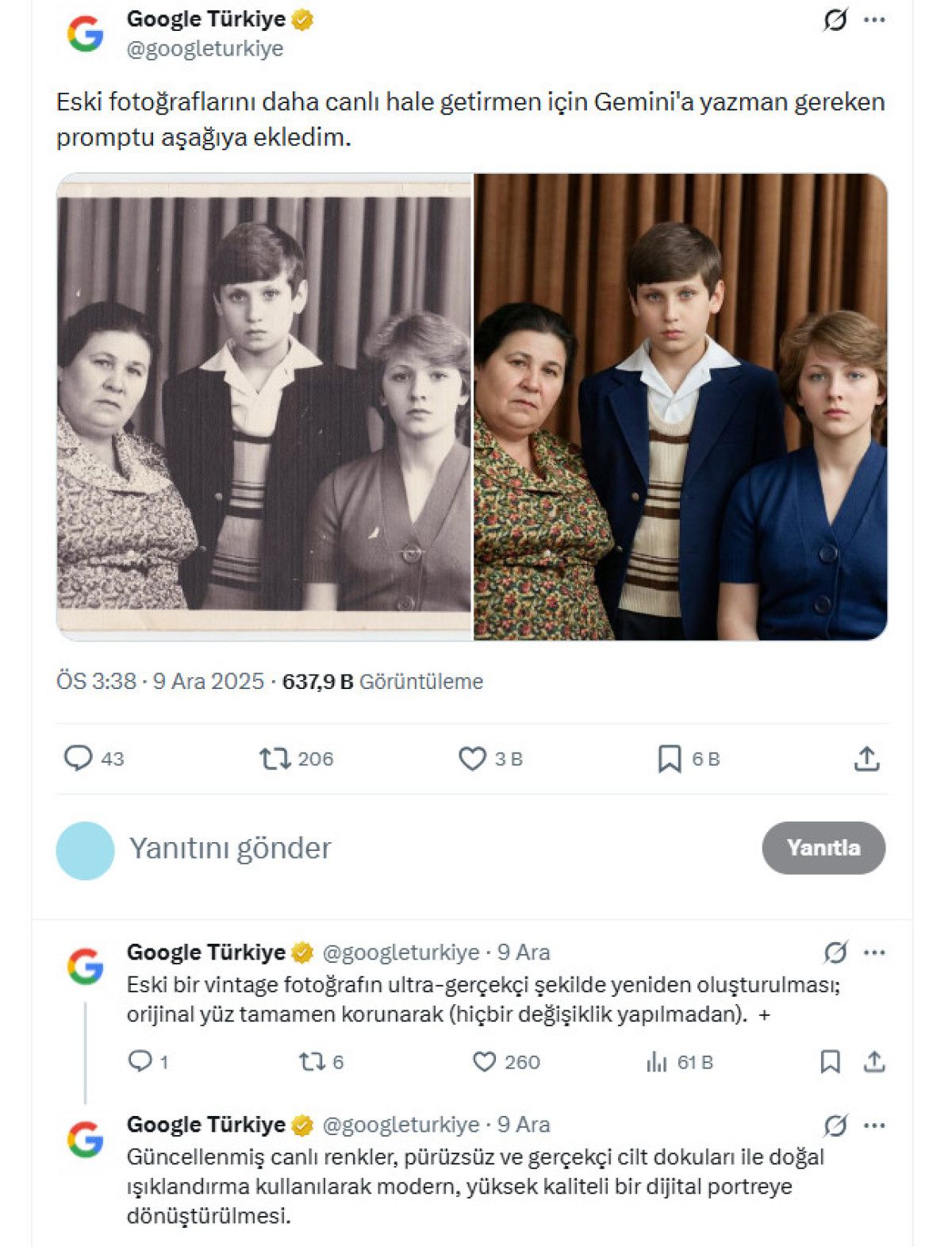 Paylaşımda eski bir aile fotoğrafının restore edilmiş hali de örnek olarak yer aldı.