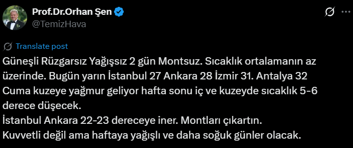Hafta sonu ise kuzey bölgelerde yağmur etkili olacak ve iç bölgelerde sıcaklık 5-6 derece düşecek. Buna göre İstanbul ve Ankara’da sıcaklıklar 22-23 dereceye kadar gerileyecek. Şen, vatandaşlara “Montları çıkarın” uyarısında bulundu.
