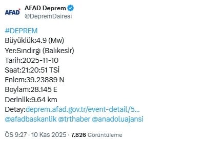 Korkutan depremler devam ediyor. Depremin merkez üssü Kandilli Rasathanesi’ne göre Balıkesir’in Sındırgı ilçesi oldu. Depremin büyüklüğü ise 4.9 olarak açıklandı.