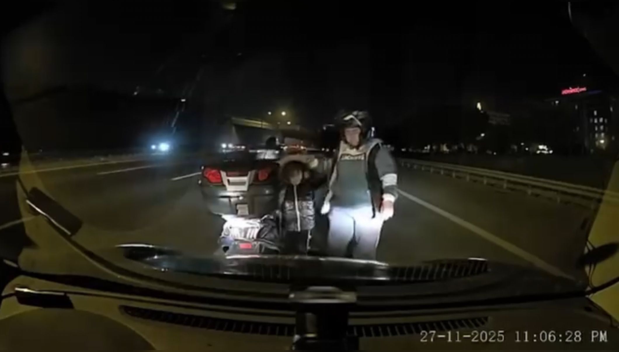 Tartışma sırasında yaşanan ihmaller zinciri bununla da sınırlı kalmadı. Kadın sürücü, kaskı olmayan çocuğuyla tekrar motosiklete bindiği sırada, otoyolda seyreden başka bir motosiklet sürücüsü de olaya dahil olmak için durdu.