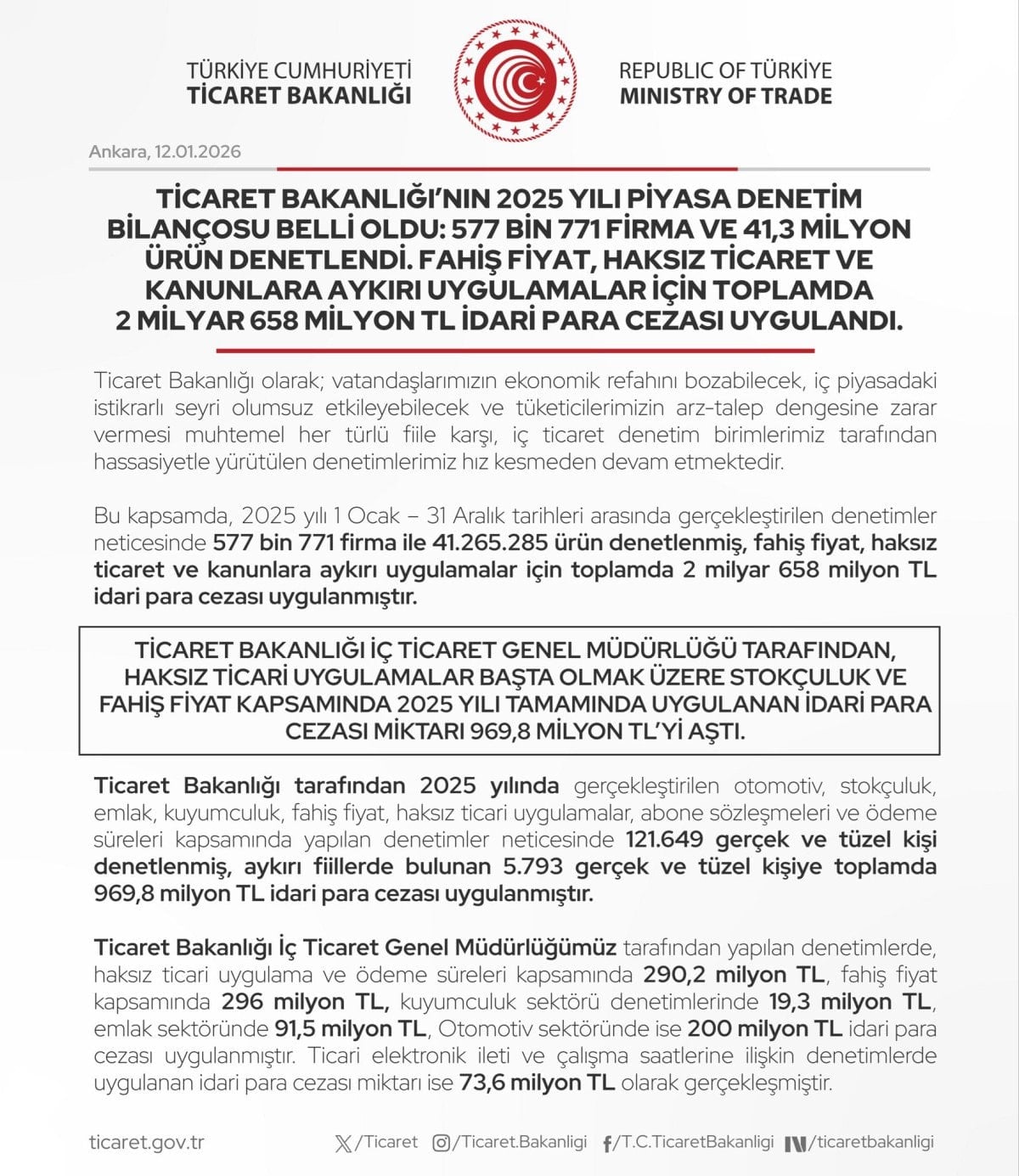 Ticaret Bakanlığı, geçen yıl 577 bin 771 firma ve 41,3 milyon ürünü denetledi. Bu denetimlerde fahiş fiyatlar, haksız ticaret ve yasalara aykırı uygulamaların tespit edilmesi durumunda 2 milyar 658 milyon lira idari para cezası kesildi.